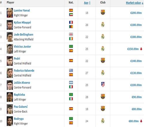 雷速体育10月2日宣 德转今日更新西甲球员身价排行,亚马尔2亿欧仍居首,姆巴佩、贝林分列二三位,维尼修斯跌至1.5亿欧。