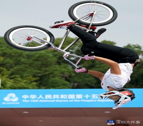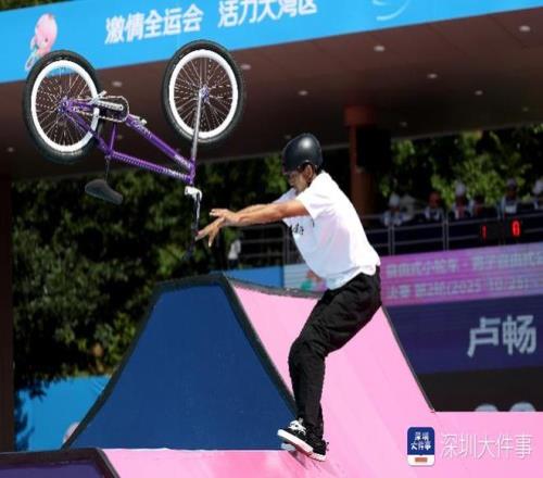 2025年10月25日,十五运会男子自由式公园赛决赛,广东队卢畅在完成动作后激动地把自行车甩向空中。