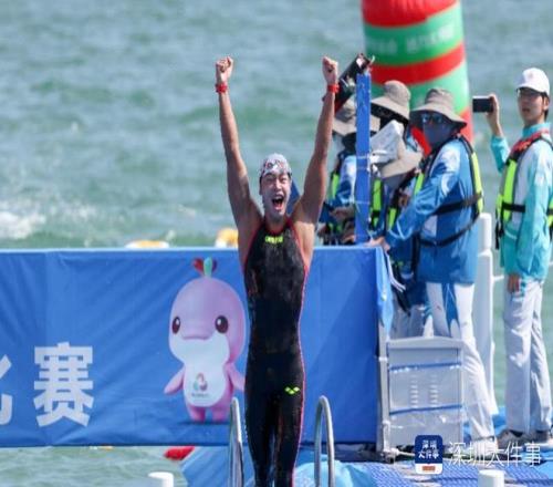 2025年11月6日,第十五届全运会马拉松游泳比赛男子组决赛,湖北体彩队张子扬率先抵达终点。