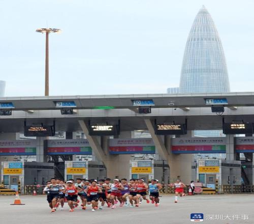 2025年11月15日,全运会首个跨境马拉松开跑,清晨7:06,男子马拉松大部队跑入香港境内,近处是深圳湾口岸大楼,远处是深圳南山地标“春笋”。