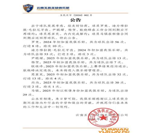 在官宣安德森离任之后,云南玉昆很快又一口气官宣8名球员离队。其中,感谢球员迪力穆拉提、罗竞、尹聪耀、杨贺、耿晓峰合同到期后不再续约,恩里克、内内则完成了解约,马镇在租借合同到期后返回上海申花。
