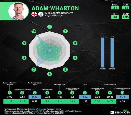 在技术特点上,沃顿并非维蒂尼亚或佩德里那样的纯组织型中场,但他兼具防守拦截与创造力,是一位务实的混合型中场球员。他战术执行力出色,比赛阅读能力强,凭借智慧和自律性对比赛产生持续影响。尽管年仅21岁,但其成熟度明显高于同龄球员。过去一年半的快速成长也印证了这一点。从英超同位置数据对比来看,他在多项关键指标上并不逊色于联赛顶级中场,包括苏比门迪、莫伊塞斯-凯塞多、罗德里和卡塞米罗。