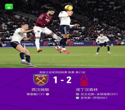 诺丁汉森林21逆转西汉姆联,多明格斯破门,吉布斯怀特点射,穆里略乌龙