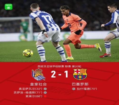 北京时间1月19日西班牙足球甲级联赛 联赛 第20轮,皇家社会主场对阵巴塞罗那。上半场,奥亚萨瓦尔凌空抽射破门。下半场,亚马尔助攻,拉什福德扳平。不过,格德斯很快便抽射得分,帮助皇社再次领先。巴萨整场比赛3个进球被吹,另外5次击中门框。全场比赛结束,巴萨1-2不敌皇社,各项赛事11连胜被终结。